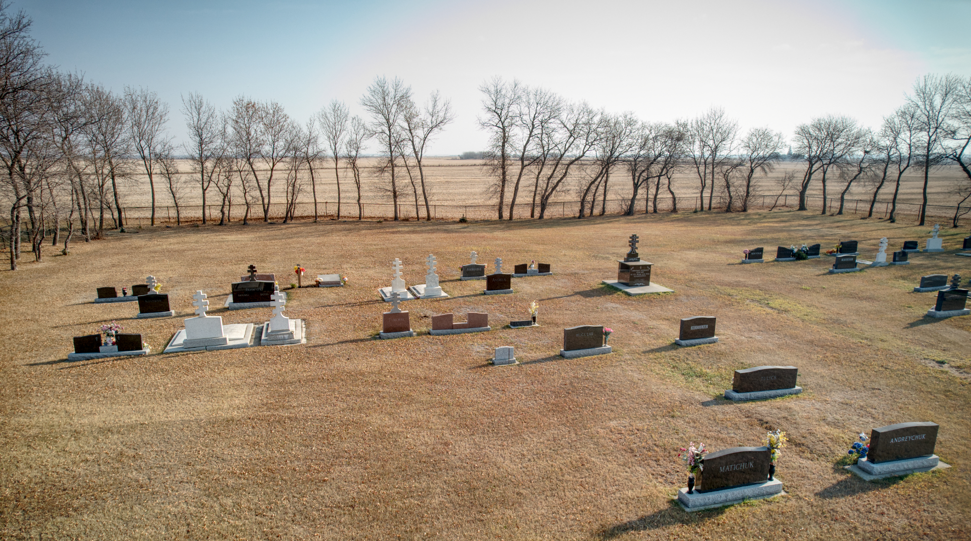 A one acre parcel of land was acquired for a church cemetery in 1925 at NW 28-56-16 W4 on the southern approaches to the town, on the east side of Secondary Highway 855. The earliest burial was that of William Lesick (d. 31 December 1952), the founding president of the church. Several local dignitaries such as the first mayor of Andrew (Tom Matichuk) and the first Justice of the Peace (Gregory Moisey) are interred in the church graveyard.