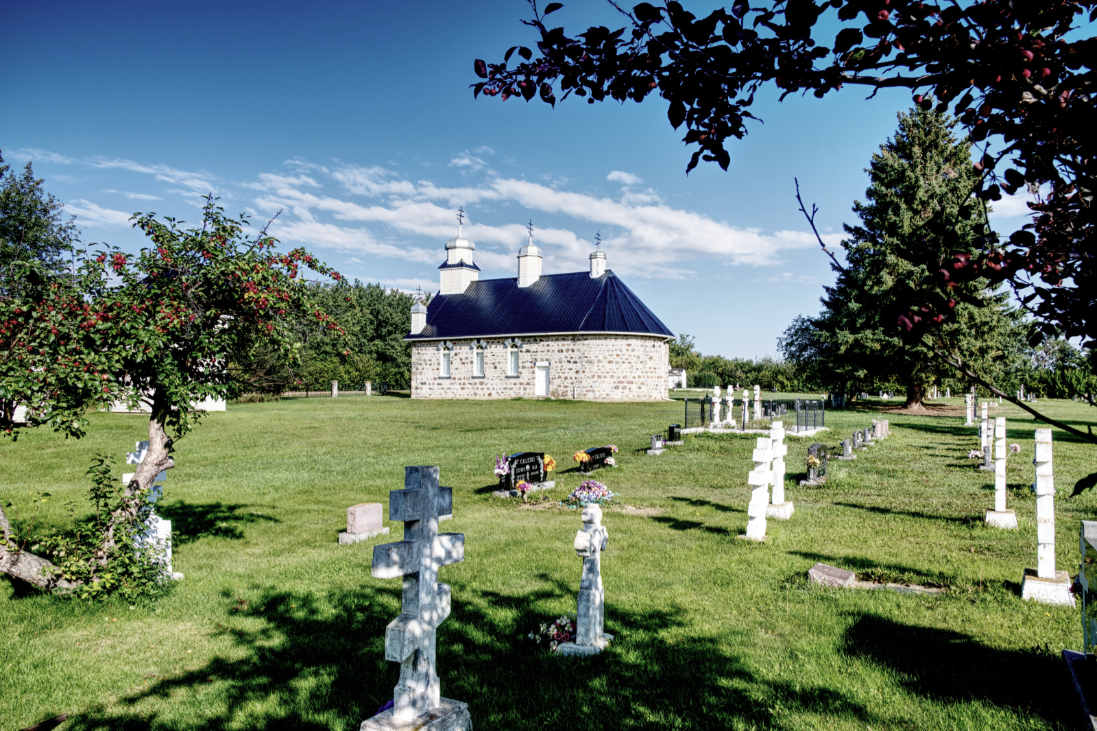 As a result of these preliminary talks, held in July 1916 at the suggestion of V. Melnychuk, two acres of land for the future church and an adjacent cemetery were generously donated by Nickolai Olynyk and Michael Grekul. Because of the availability of local rocks suitable for construction material, and to ensure that the sanctuary would be less vulnerable to fire, it was decided to build the new church out of fieldstone. That same winter, stones were gathered from the nearby farm of John Orleski. Stonemasons John Shandro and Herbert Lefe started work on the two-foot-thick sanctuary walls in April 1917, after which Nick Hrehirchuk constructed the roof. Harry Osietski, a well-known church builder, put the crowning touches on the edifice by making four domes. On June 20, 1917 the church was registered under the Alberta Societies Act as the Ukrainian Orthodox Church of Saints Peter and Paul, legally enshrining the name. The first service was appropriately held on the patron saints' day the following month (12 July 1917), with Reverend Gregory Soroka of New York officiating at the dedication. The first wedding took place on July 25, 1917, the first funeral and internment in the church cemetery occurring in the spring of 1918 with the death of Ivan Lakusta.